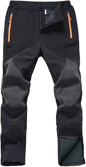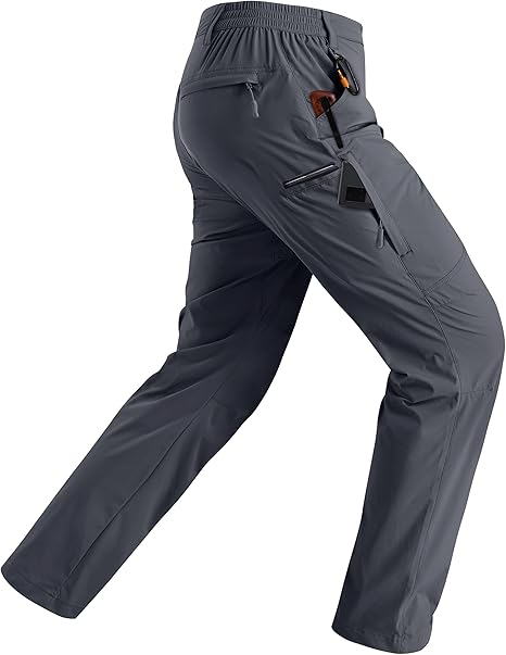 Find pants with: a stretchy material to help you climb steep slopes, strong knees to keep them long-lasting, a zippered pocket to hold snacks or other small items, and a waterproof coating to keep the rain out on rainy days.